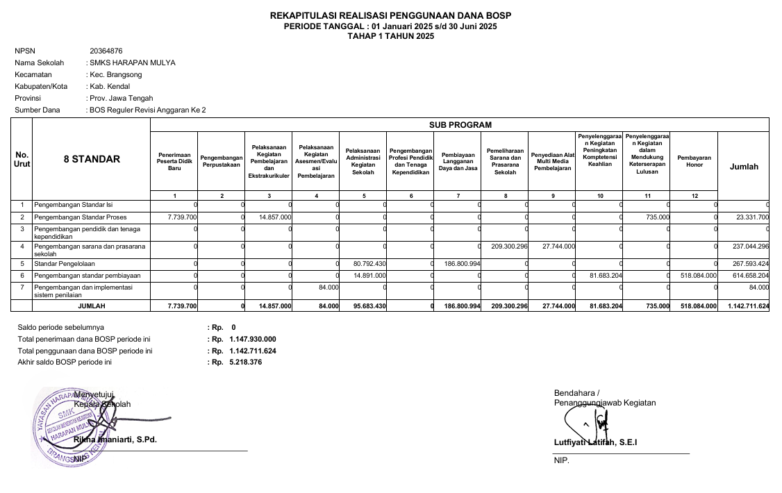 LAPORAN REKAPITULASI REALISASI PENGUNAAN DANA BOS REGULER TAHAP I TAHUN 2025 SMK HARAPAN MULYA
