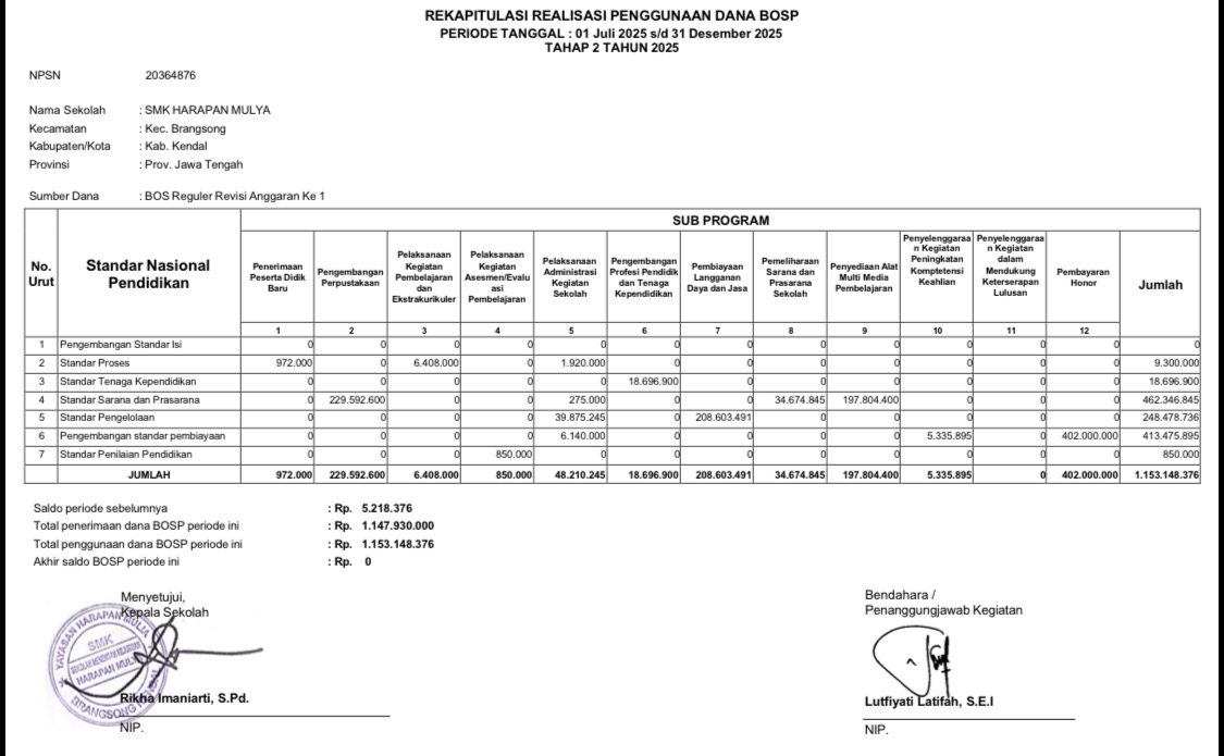 LAPORAN REKAPITULASI REALISASI PENGUNAAN DANA BOS REGULER TAHAP 2 TAHUN 2025 SMK HARAPAN MULYA
